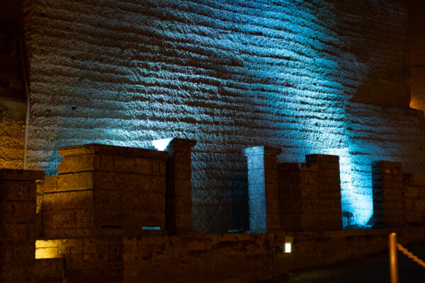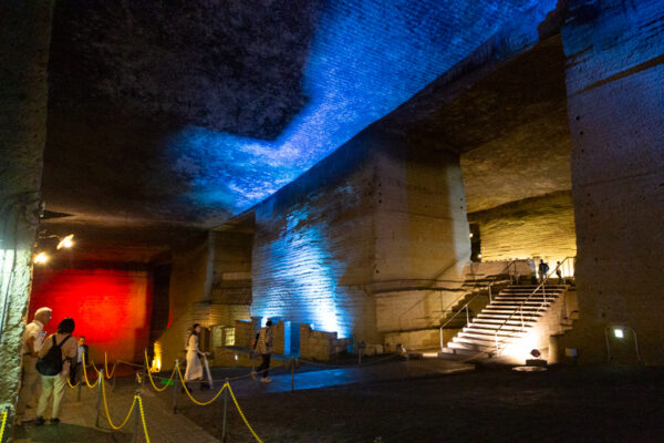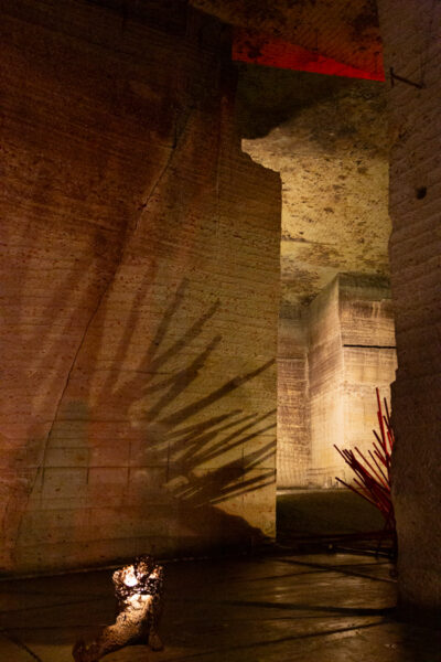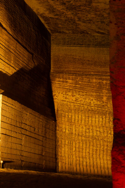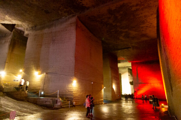 Dann begibt man sich über Treppen nach unten. Die nach und nach entstandenen grossen Hallen haben gigantische Ausmasse. Besichtigt werden kann ca. 1/3 des gesamten alten Steinbruchs, und selbst das ist schon gewaltig. Farbige Illuminationen hübschen alles noch etwas auf. Für gebrechliche (oder auch faule) Personen ist die Besichtigung per motorisiertem Caddy möglich.