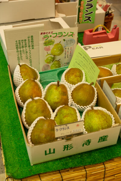 Kommen wir auf die Birne zurück. Just als wir dort waren, war der erste Verkaufstag dieses besonderen Obsts, der regelrecht zelebriert wird. Staunend standen wir im Bahnhof Yamagata vor diesem Riesenobst, dessen Exemplar sicher an die 600 Gramm wiegt.