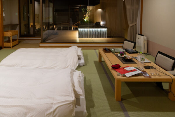 In einem japanischen Onsenort gilt als Herberge der ersten Wahl ein sogenanntes Onsenhotel. Das sind von aussen gesehen riesige, eher unansehnliche Kästen. Sie bestechen durch ihre inneren Qualitäten: unübertroffener Service, traditionelle Zimmer mit Tatami, ein grosszügiges Thermalbad und natürlich perfektes japanisches Essen mit lokalen Köstlichkeiten.