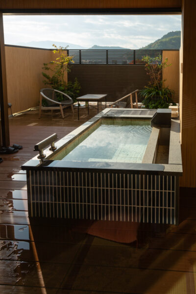 Das Highlight war aber der private Rotemburo (Aussenbecken/-bad) auf der Veranda. Zwar war dort kein Thermalwasser (das gibt es nur im Hotelbad), aber wir bevorzugten es dann für den morgendlichen und abendlichen Wasch- und Entspannungsgang, denn zum einen war der Weg zum Bad ziemlich weit, und der dortige Rotemburo nicht so attraktiv. Zudem ist es selten, dass wir mal gemeinsam im heissen Wasser sitzen können. Zum Glück passten wir auch beide rein. 😊