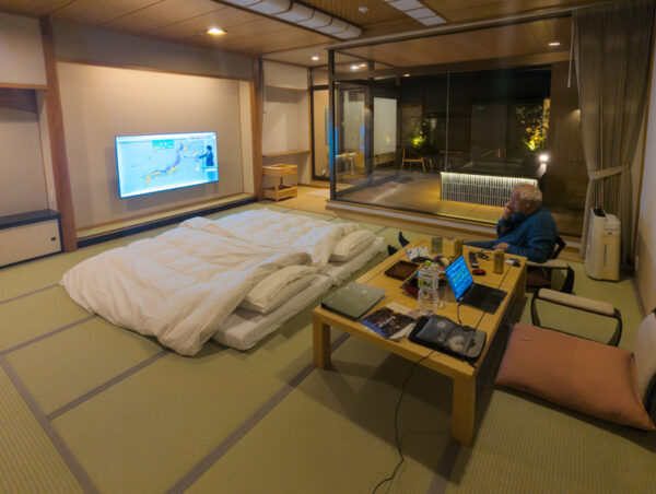 Und eben, der Knaller war unser Zimmer. Warum wir diese riesige und ziemlich luxuriöse Variante bekommen haben, war uns nicht ganz klar. Thom hatte diese nicht gebucht, denn diese Kategorie sprengt unser Budget. Das Hotel war gut ausgelastet mit einigen asiatischen Reisegruppen. Vielleicht haben sie uns als Long-staying-guests einfach grosszügig upgegradet? Jedenfalls waren wir recht sprachlos über das grosszügige, wunderschöne 12 Tatami-Zimmer.