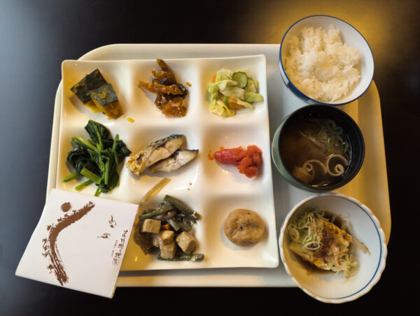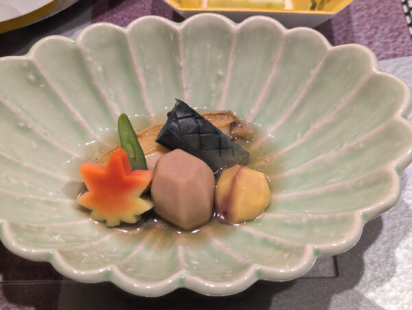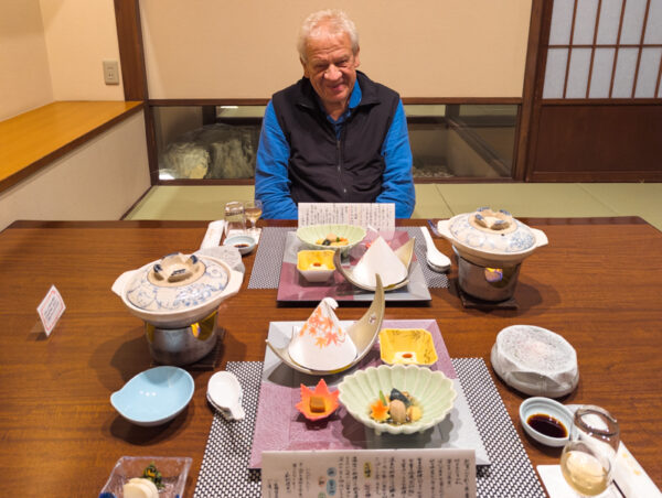 In der Regel verbringt die/der japanische Onsenbesucher:in dort eine Nacht mit Halbpension. Wir blieben drei Nächte, was eher ungewöhnlich ist, allerdings hatten wir nur an einem Abend das Essen mitgebucht (es wird sonst schlicht zu üppig). Dort wird vor allem Kaiseki-Küche serviert, die hohe japanische Kochkunst, die mit unendlichen Feinheiten aufwartet, die sich ungeschulten Augen nicht erschliessen. Unsere Lehrern Inoue-san hat uns da ein bisschen was beigebracht. Dass regionale und saisonale Spezialitäten zum Zuge kommen, ist sowieso ein „Must“. Die saisonale Zusammensetzung der Speisen sowie die Anrichtung wird kunstvoll dekoriert, wie zum Beispiel mit einer (essbaren) Dekoration eines sich rötenden Ahornblatts für den Herbst. Alles hat seinen Sinn.